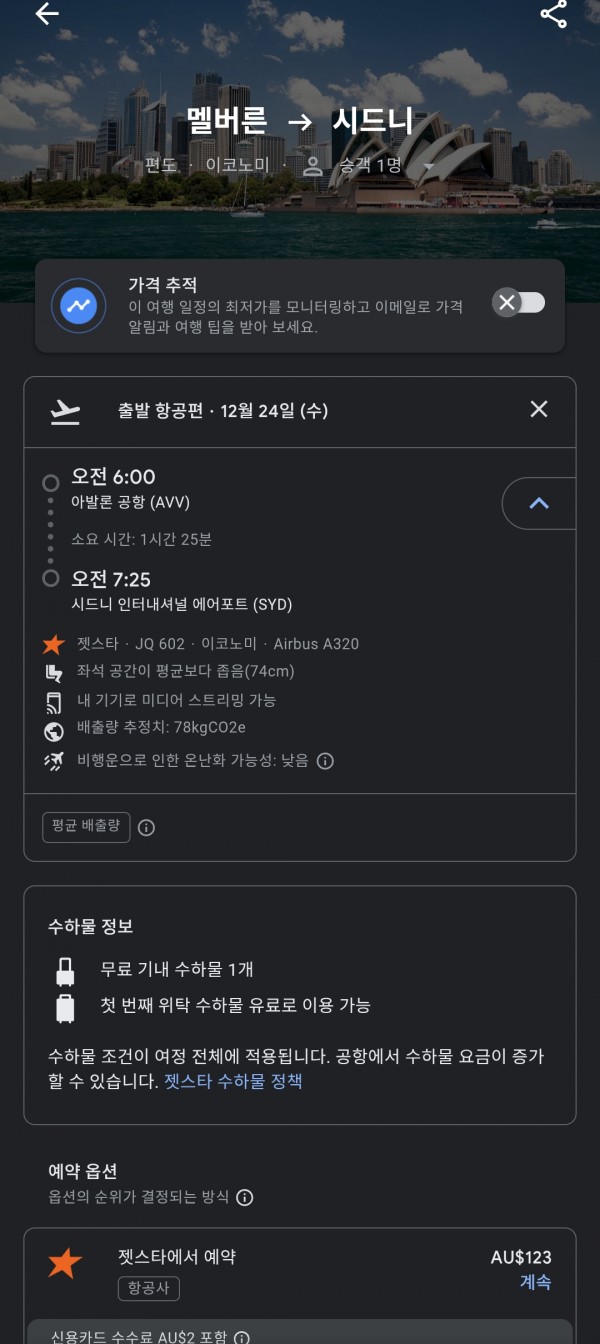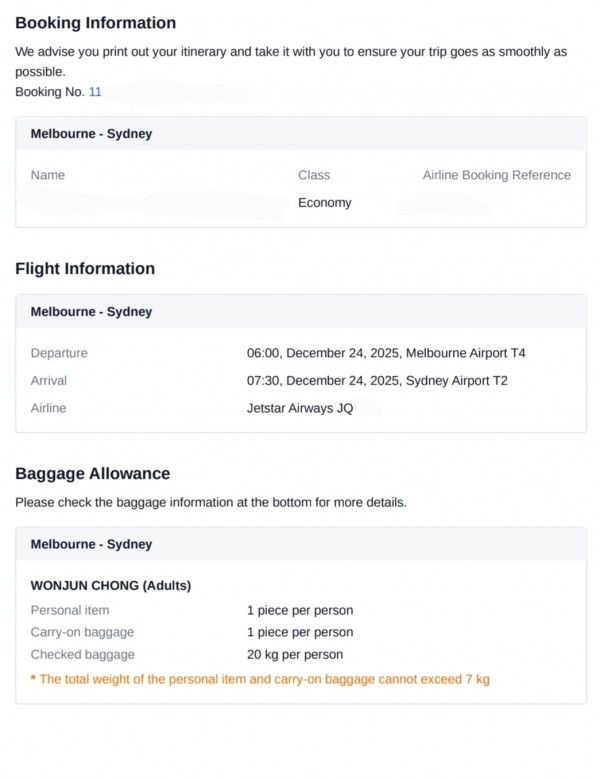 멜번에서 시드니행 비행기티켓 팝니다(양도합니다) 2025년12월24일