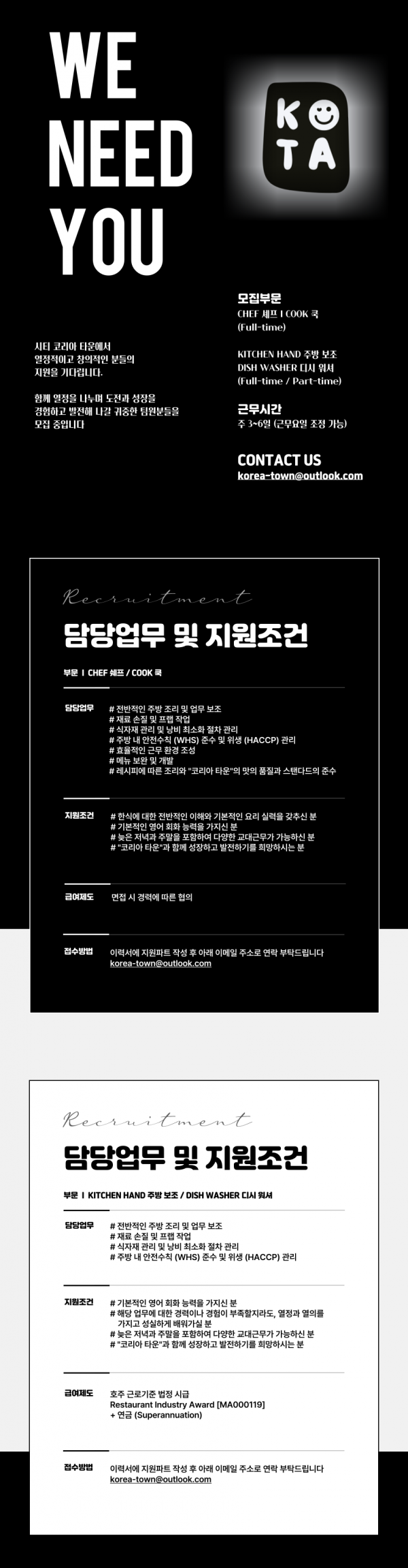 [ 모집부문: KITCHEN HAND 주방 보조 / DISH WASHER 디시 워셔 ] I [ Full-time / Part-time ]