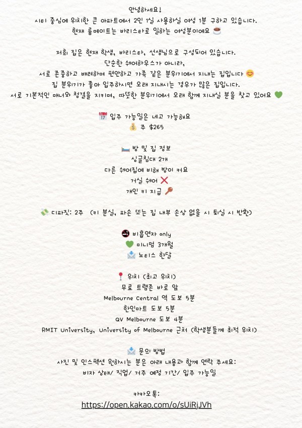 밝고 즐거운 분위기! 멜번 시티 큰방 좋은 위치 2인1실 여자 1분 구해요 :) 페이지 정보 작성자 멜버니언2022 쪽지보내기 자기소개 아이디로 검색 쪽지보내기 자기소개 아이디로 검색 댓글 0건 조회 127회 작성일 26-03-21 11:28 목록 본문 페이스북 공유 트위터 공유 구글+ 공유 관련링크 https://open.kakao.com/o/sUiRjJVh 5회 연결 이전글시티 저렴한 독방 쉐어생 구합니다. 주 260붛 빌포함 거실쉐어X 26.03.21 다음글시티 3명만 사는집 22일부터 커플룸 또는 여여 단기 쉐어 구해요! 26.03.21 댓글 0 댓글목록 등록된 댓글이 없습니다.